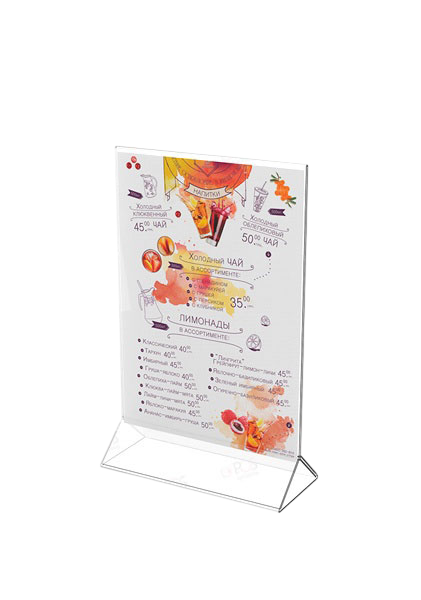 Подставка под информацию с треугольным основанием (менюхолдер) — удобное и надёжное решение для размещения меню, рекламных материалов, акций и другой информации. Простая конструкция позволяет ставить подставку на стол или полку, не требуя дополнительных креплений, при этом она остаётся устойчивой и легко читаемой.