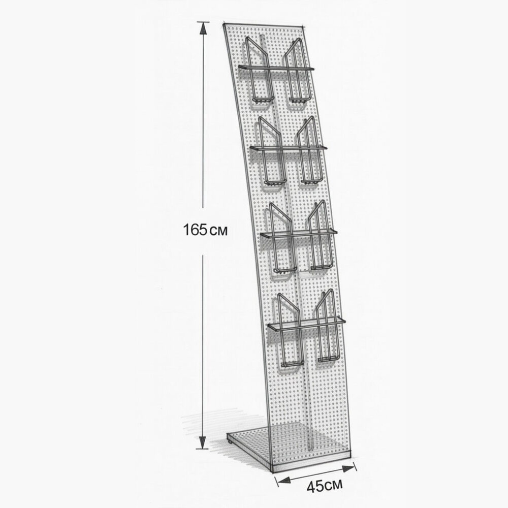 Стойка «Парус» перфорированная (изогнутая) представляет собой напольную металлическую конструкцию с перфорированной панелью, предназначенную для размещения навесных элементов POS-оформления, таких как рамки, проволочные карманы и крючки. Перфорация обеспечивает высокую функциональность: на стойку можно монтировать различные аксессуары, адаптируя её под конкретные задачи выкладки и оформления.